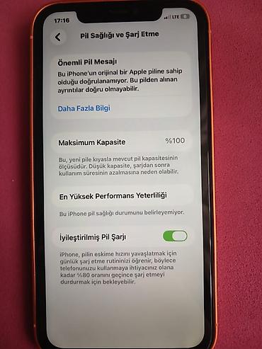 - Batareya: sistemdə maksimum tutum 100% göstərilir; bildirişdə bu cihazda Apple orijinal batareyasının təsdiqlənmədiyi qeyd olunur