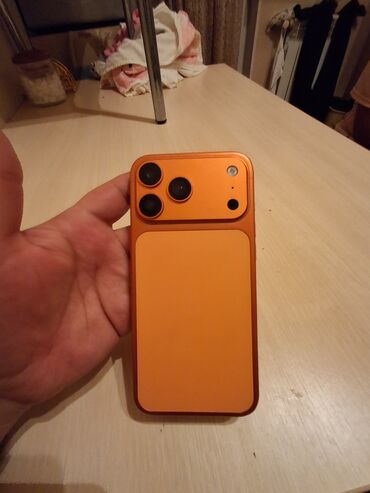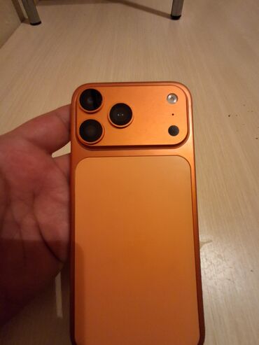 iPhone 17 Pro MaxMəhsul: iPhone üslublu smartfon (iOS interfeysi), narıncı rəngli korpuslu