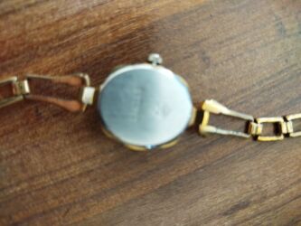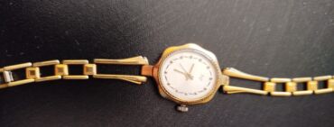 Qızılı rəngdə qadın qol saatı - Mexanizm: mexaniki (əl ilə qurulan) - Korpus: kvadrat formalı, qızılı rəngli metal - Siferblat: açıq rəng, “Roman” (XII, III, VI, IX) indekslər, mərkəzdə kiçik sani...