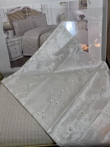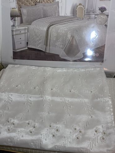 Ağ rəngdə, zərif dizaynlı yataq örtüyü dəsti _ Yenidir hec istifade edilmeyib yastiq uzleride var zamoklu 2 boyuk 1 balaca .unvan 20 yanvar - Material: parıltılı atlas-saten və nazik şifon qatları...