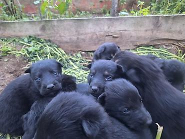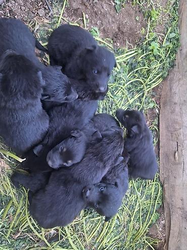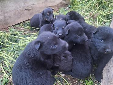 Tam qara rəngdə Alman çoban iti (Deutscher Schäferhund) balaları - Cins: Deutscher Schäferhund (Alman çoban iti) - Rəng: Black (tam qara) - Ananın şəkli əlavə olunub; balalar qapalı, taxta yuvada ...