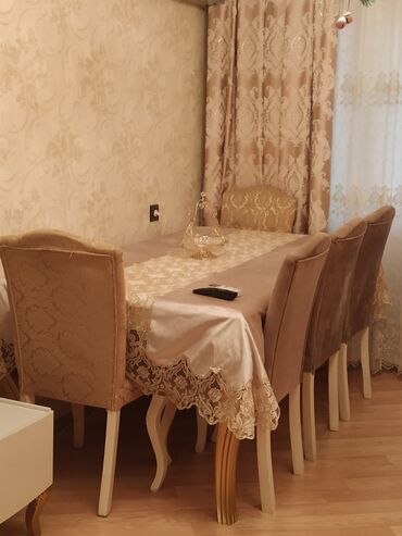 Klassik yemək otağı dəsti Tərkibi: - 1 ədəd iri yemək masası (dördkünc, geniş səthli), 8 ədəd stul ilə - 1 ədəd iri vitrin şkafı (3 qapılı, şüşəli rəflər, aşağıda çekmecələr) - 1 ədəd tək vitrin (...