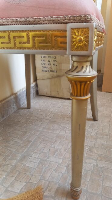 - Material: Ağaç korpus (boya və qızılı bəzəklər), yumşaq süngərli oturacaq, parça üz döşəmə.