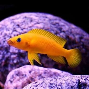 Akvaryum üçün parlaq sarı rəngli siklid balığı (Neolamprologus leleupi – “Lelupi” cichlid).