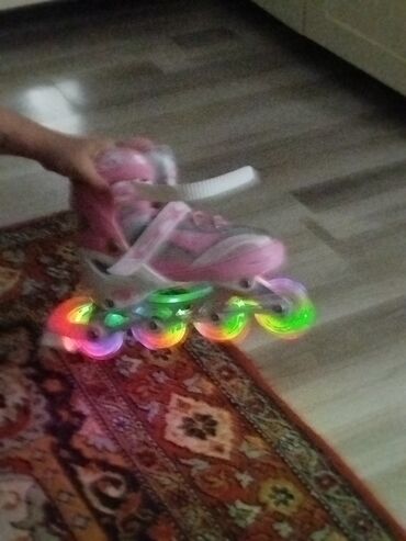 Uşaq üçün təkərli konkisət (roller) - Rəng: açıq çəhrayı/çəhrayı - Model: inline (bir sırada 4 təkər) - Korpus: möhkəm plastik çubuqlu çəkmə tipi - Daxili hissə: yumşaq, hündür boğazlı içlik – ayağ...