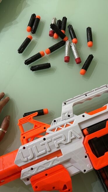 Qeyd: Yalnız Nerf Ultra tipli dartlarla istifadə olunur; şəkillərdə bir neçə dart daxil edilib. Batareya ilə işləyən motorlu atış mexanizmi mövcuddur.