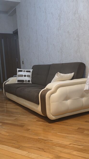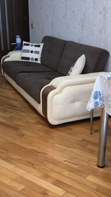 - Material: Yumşaq parça oturacaq-arxalıq; yan hissələr və baza dərimsi/krem örtüklə. Yanlarda dekorativ taxta elementlər.