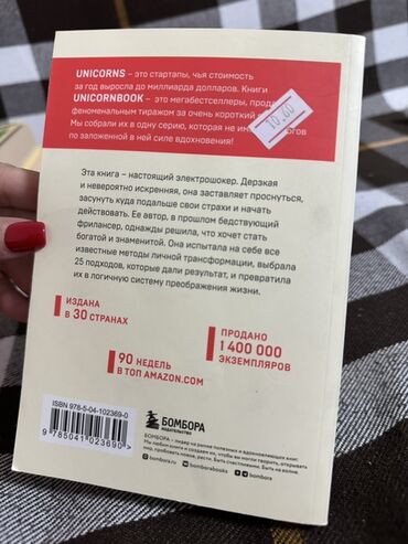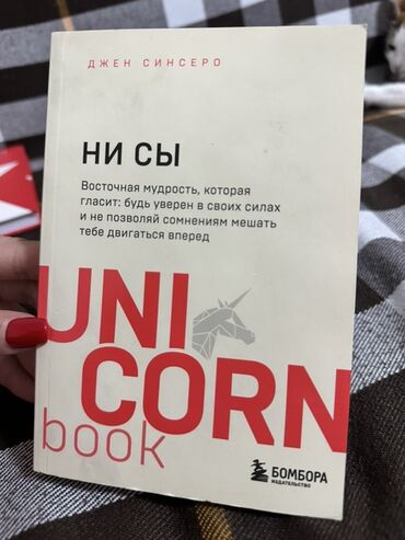 Qapaq dizaynı: Açıq krem rəngli üz qabığı, qırmızı “UNICORN book” yazısı və stilizə edilmiş unicorn təsviri. Arxa üzündə rus dilində annotasiya və barkod mövcuddur.
