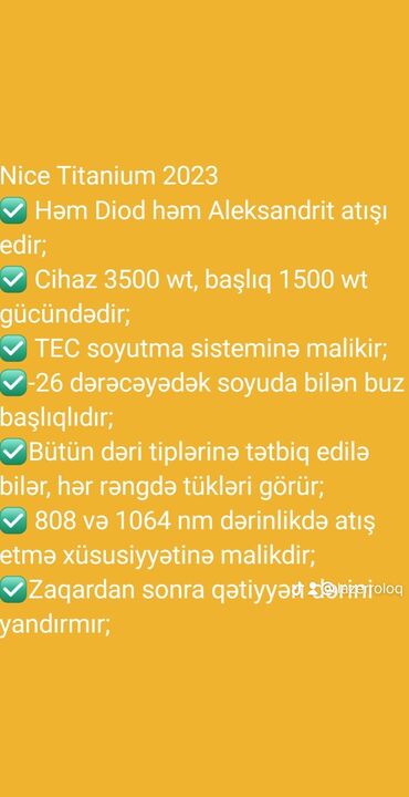 NiceTitanium diod lazer epilyasiya aparatı Salam diod lazer aparatı çox ideal vəziyyətdədi.qiymətə hazır bizneslə birlikdə daxildir.əlavə olaraq heç birşey almayacaqsınız.sadəcə qolunuzu qatlayıb ...