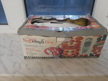 - Nicer Solingen Dicer: iki ədəd dəyişdirilə bilən kəsmə paneli (küp və jülyen üçün), itələyici/başlıq hissələri, təmizləmə fırçası