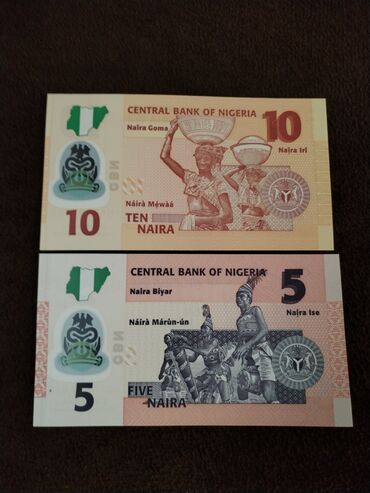 - Mərkəzi Bank of Nigeria emissiyası olan iki banknot dəsti: 10 Naira və 5 Naira.