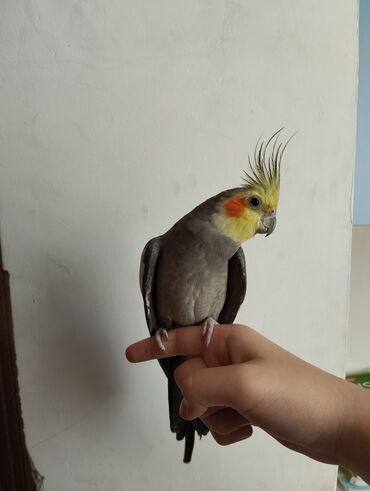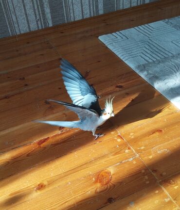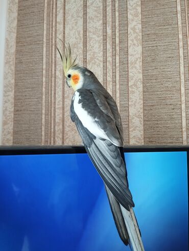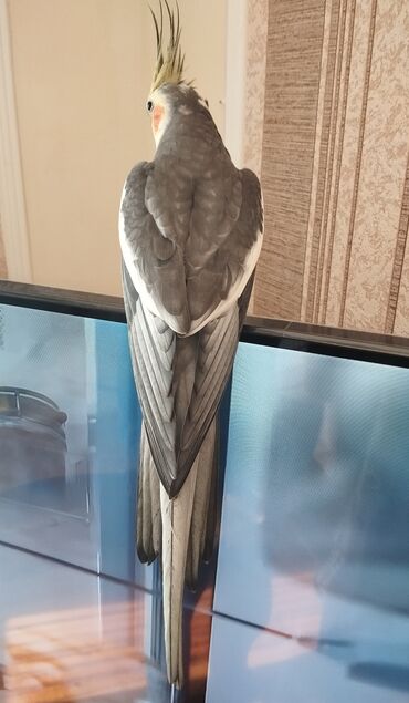 Nişanlı nimfa tutuquşuları (Cockatiel) – 2 ədəd - Rənglər: krem/sarı ağ, yanaqlarda narıncı ləkələr; biri krem, digəri boz naxışlı. - Xasiyyət: əli öyrəşmiş, insanla təmasa gəlir, sakit və mehriban...