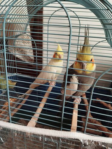 Ev quşları – Nimfa (Cockatiel) cütü və qəfəs dəsti - Növ: Nimfa (Cockatiel) papağanları, başda sarı çəlpələng, yanaqlarda narıncı ləkələr - Rənglər: biri boz-ağ-sarı qarışıq, digəri açıq sarı - Cü...