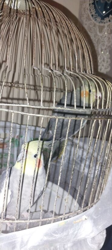 Nimfa (cockatiel) cütlüyü – qəfəs ilə birlikdə - Növ: Nimfa papağanı (cockatiel), parlaq sarı-boz rəng çalarları və yanaqlarda narıncı ləkələr - Say: 2 quş – bir cüt - Qəfəs: Dairəvi üstlü metal q...