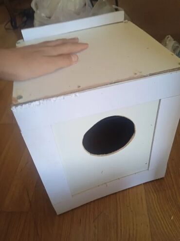 - Yuvalıq: şəkillərdəki ağ rəngli taxta yuva qutusu (giriş dəliyi olan), üst hissəsində asma qayışı/bağlama üçün iplər görünür. Cütlüklə çoxalma üçün uyğundur.
