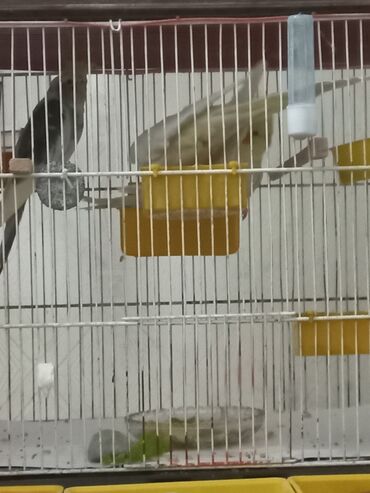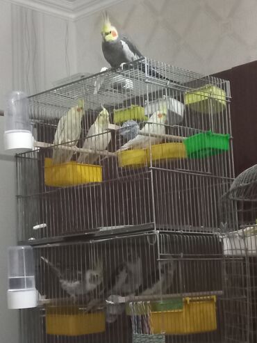 Məhsul: Nimfa (cockatiel) tutuquşu satilir Təsvir: - Bir neçə nimfa tutuquşusu – sarı baş taclı, ağ və boz rəng variasiyaları görünür. - Ağ metal qəfəs: ön tərəfdə iki dairəvi girişli qapı, alt h...
