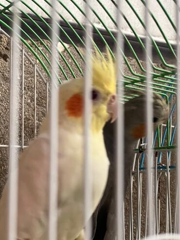 Nişanlı nimfa tutuquşuları (Cockatiel) – 2 ədəd - Rənglər: krem/sarı ağ, yanaqlarda narıncı ləkələr; biri krem, digəri boz naxışlı. - Xasiyyət: əli öyrəşmiş, insanla təmasa gəlir, sakit və mehriban...