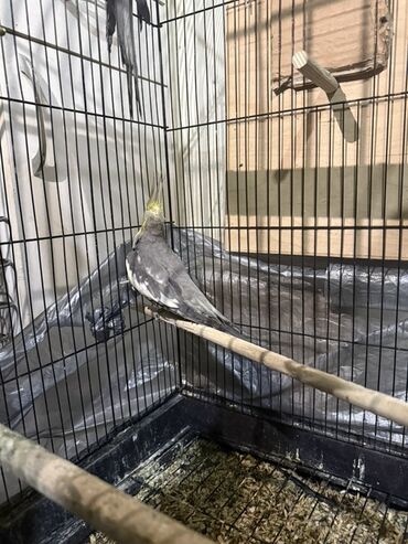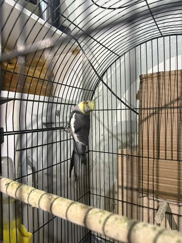 Nimfa (Cockatiel) tutuquşusu və qəfəs dəsti - Növ: Nimfa (cockatiel) – sarı taclı, yanaqlarda narıncı ləkələr - Rəng: yaşıl-boz naxışlı qanadlar, sarı baş və quyruq ucları - Aksessuarlar: metal qə...
