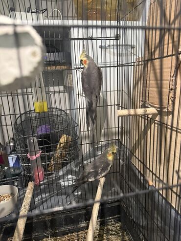 Nimfa (Cockatiel) tutuquşuları və qəfəs dəsti - Növ: Nimfa tutuquşusu (Cockatiel) - Rənglər: birinin başı sarı, yanaqları narıncı ləkəli, bədənində boz-ağ lələklər; digəri əsasən açıq sarı tonlarda