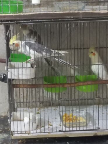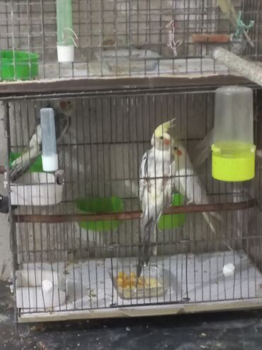 Məhsul: Nimfa (cockatiel) tutuquşu satilir Təsvir: - Bir neçə nimfa tutuquşusu – sarı baş taclı, ağ və boz rəng variasiyaları görünür. - Ağ metal qəfəs: ön tərəfdə iki dairəvi girişli qapı, alt h...
