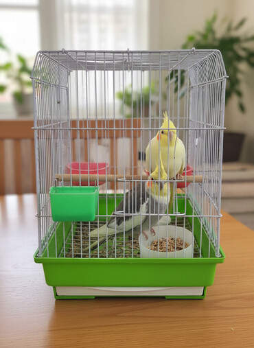 Nimfa (Cockatiel) tutuquşusu və qəfəs dəsti - Növ: Nimfa (cockatiel) – sarı taclı, yanaqlarda narıncı ləkələr - Rəng: yaşıl-boz naxışlı qanadlar, sarı baş və quyruq ucları - Aksessuarlar: metal qə...