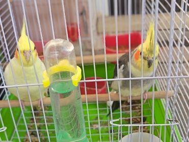 Nymph parakitləri (Cockatiel) – cüt - Rəng: ağ-boz bədən, sarı baş və daraq, yanaqlarda narıncı ləkələr - Cins: cüt (dişi və erkək) - Özünə gələn, sakit və sosial quş növüdür; insanla ünsiyyətə te...
