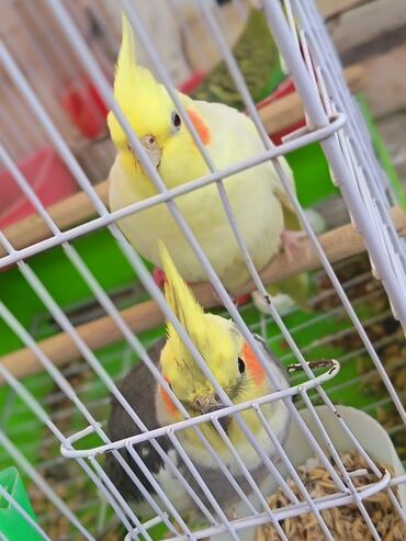 Ev quşları – Nimfa (Cockatiel) cütü və qəfəs dəsti - Növ: Nimfa (Cockatiel) papağanları, başda sarı çəlpələng, yanaqlarda narıncı ləkələr - Rənglər: biri boz-ağ-sarı qarışıq, digəri açıq sarı - Cü...