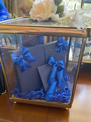 Xonça və nişan üçün dekorativ vitrinlər və aksesuar dəsti - Qızılı metallı çərçivəli, şüşə vitrin qutuları: kvadrat, dairəvi, ürək və romb formalarında. Hər biri güllü/orkide kompozisiyası, qızılı...
