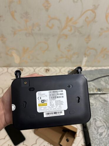 - Nokia marka ağ Wi‑Fi/router cihazı. Üzərində “NOKIA” loqosu, ön paneldə bir neçə LAN portu və göstərici işıqları var. Qidalandırıcı (adapter) və şəbəkə kabeli ilə birlikdə. - Otaq üçün TV antenas...