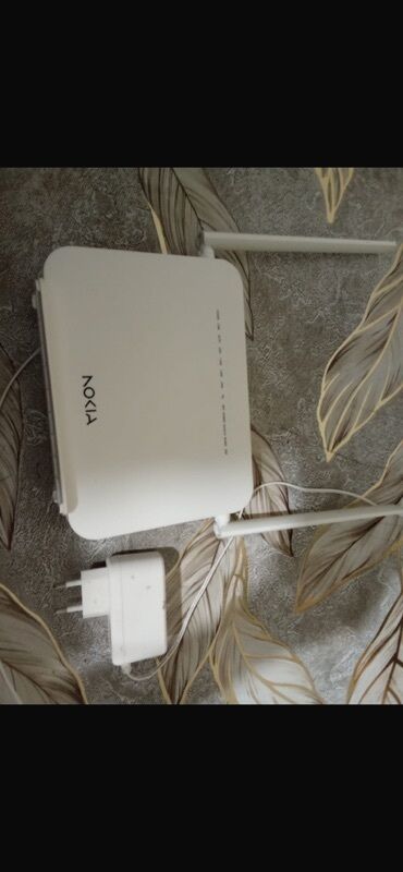 - Nokia marka ağ Wi‑Fi/router cihazı. Üzərində “NOKIA” loqosu, ön paneldə bir neçə LAN portu və göstərici işıqları var. Qidalandırıcı (adapter) və şəbəkə kabeli ilə birlikdə. - Otaq üçün TV antenas...