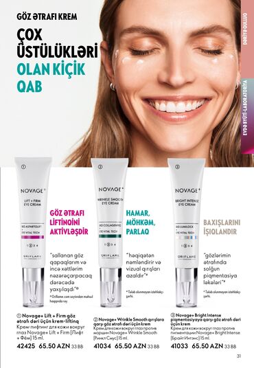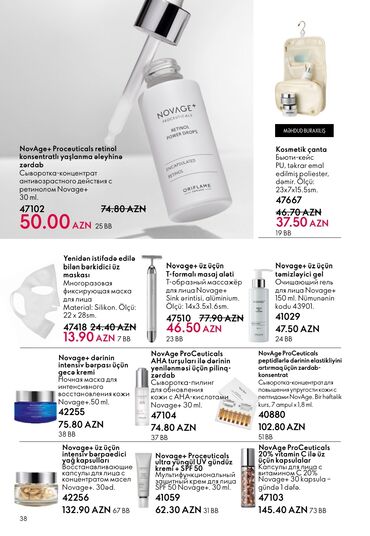 Qeyd edilən məhsullar Oriflame NovAge və NovAge ProCeuticals xəttinə aiddir, klinik sınaqlara əsaslanan formulasiyalarla hazırlanıb və dəri elastikliyi, rahatlığı, parlaqlığı və yenilənməsi üzərində işləmək üçün nəzərdə tutulub. İstifadə qaydaları və tərkib üstünlükləri məhsul təsvirlərində göstərilib.