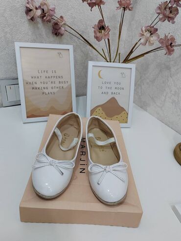 Uşaq qız üçün ağ rəngli klassik baletka ayaqqabılar. - Model: Mary Jane tipli, üst hissədə bantlı bağlama - Rəng: Parlaq ağ - Bəzək: Burun hissəsində iri atlas qəhqazı (fioka) - Ölçü: 29 (daban al...