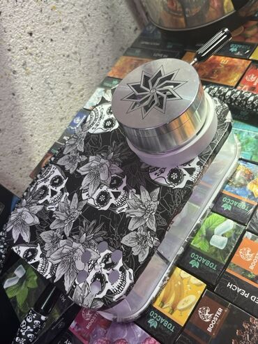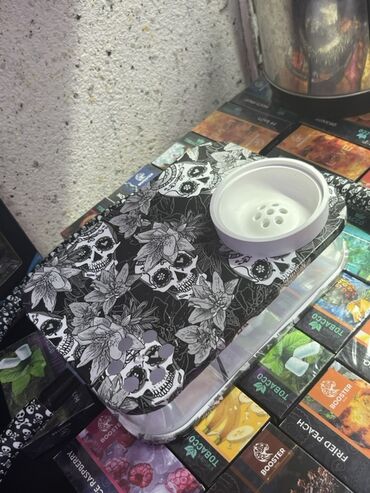 - Qara-ağ “skull & flowers” naxışlı böyük qatlanan/tray tipli iş səthi – tütünü rahat bölmək və hazırlamaq üçün.