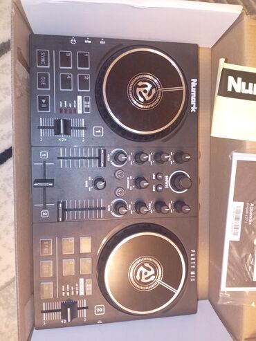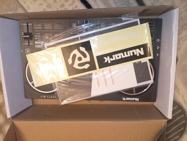 - Qutu məzmunu: controller, sənədlər və Numark stikerləri görünür