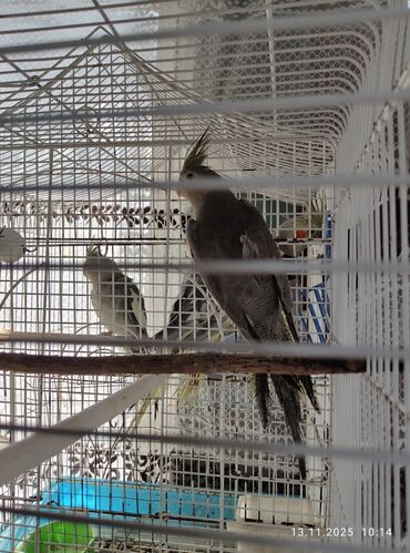 Məhsul: Nimfa tutuquşları (cüt) Təsvir: - Kafesdə bir cüt nimfa (cockatiel) tutuquşu göstərilir: biri klassik boz-sarı rəngli, yanaqlarında narıncı “ləkələr”; digəri mirvari (perl) naxışlı, başınd...