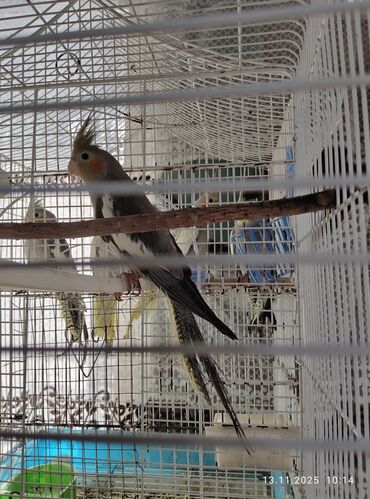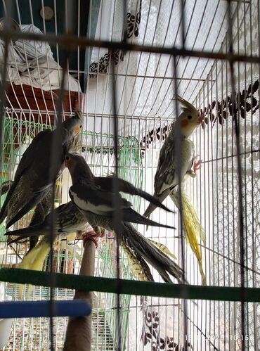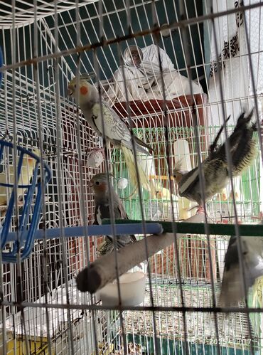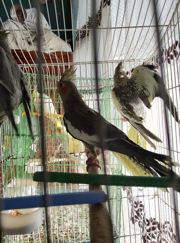 Nimfa (Cockatiel) tutuquşuları və qəfəs dəsti - Bir neçə nimfa tutuquşusu: boz-gövdəli, sarı çılpızlı və yanaqlarında narıncı “yanaq ləkəsi” olan fərdlər. Şəkillərdə həm klassik boz, həm də ləkəli...