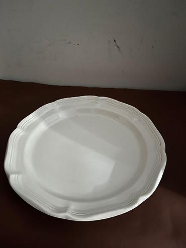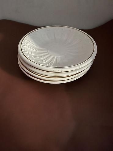 - Kiçik boşqablar dəsti: ağ, relyefli dekor, nazik qızılı haşiyə. Günlük və ya çay süfrəsi üçün ideal ölçü.