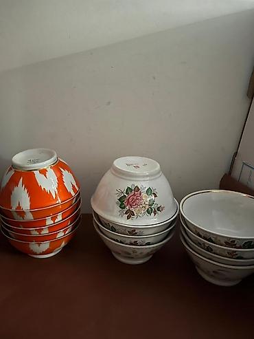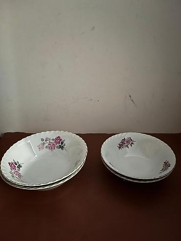 - Porcelain qapaqlı qazan (tureen): ağ rəngdə, üzərində mavi zolaqlar, yanlarda tutacaqlar və top formalı qulplu qapaq. Şorba, plov, isti yeməklərin servisində praktikdir.