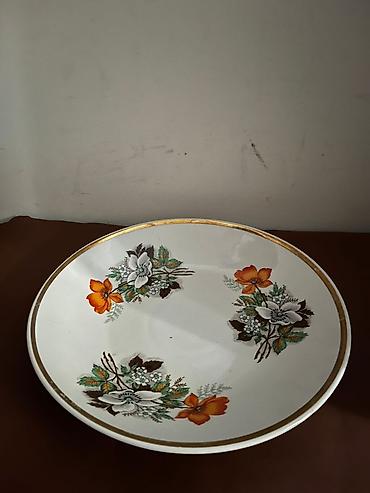 - Dərin servis boşqabı: ağ fon, qızılı haşiyə, dörd tərəfdə narıncı-ağ çiçək buketləri. Salat, meyvə və ya isti yeməklərin təqdimatı üçün yararlıdır.