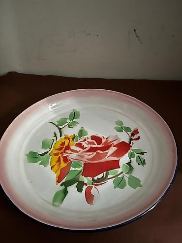 - Böyük metal tepsi: dairəvi forma, solğun çəhrayı haşiyə, mərkəzdə qırmızı və sarı qızılgül naxışı, yaşıl yarpaqlar. Süfrəyə yemək/çəki qabı kimi və ya dekor üçün uyğundur.