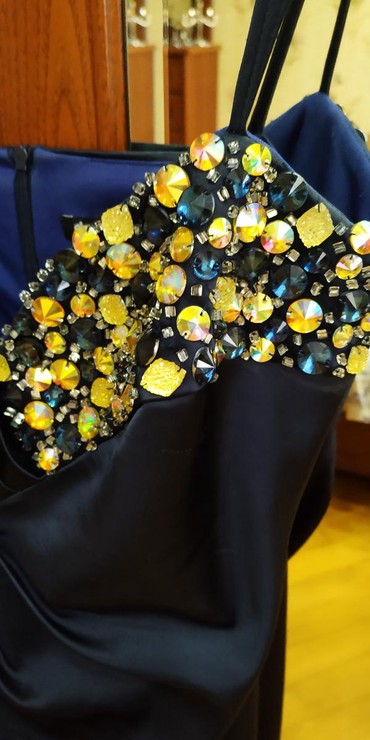 Очень красивое платье бренд со стразами.отлично сидит по фигуре.размер с.