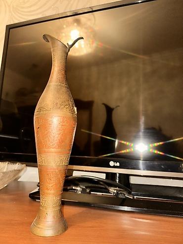 Böyük ölçülü dekorativ metal vaza - Material: bürünc tonlarında qalın metal - Üslub: Şərq motivli, əl işi kimi görünən oyma və həkk olunmuş naxışlar - Dizayn: Enli lələkvari ağızlı, uzun boğazlı v...