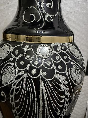 - Rəng: parlaq qara - Dizayn: gümüşü naxışlı və spiral xəttlə bəzədilmiş, klassik ornamentlər - Material: keramika/porşelen tipli ağır korpus - Forması: hündür, ensiz gövdəli, enli dalğalı ağızlı...
