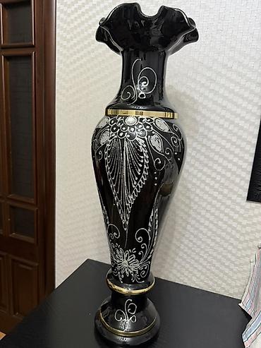 Böyük dekorativ döşəmə vazası - Material: qalın şüşə - Rəng: parlaq qara - Dizayn: üzərində qızılı və gümüşü naxışlı əl işi çiçək ornamentləri, parıltılı detallarla - Forma: ensiz boyunlu, altda y...
