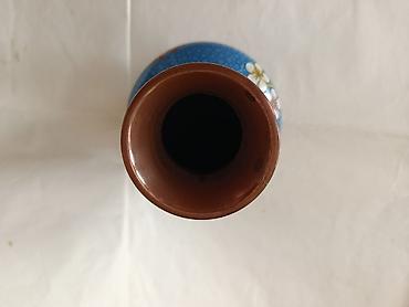 Kloazonne üslubunda dekorativ mis vaz - Material: mis əsaslı, üzəri emal (kloazonne) texnikası ilə işlənmiş - Dizayn: boz-açıq mavi fon üzərində incə spiral naxışlar; iri pion/peoniya və müxtəlif ...