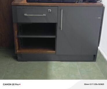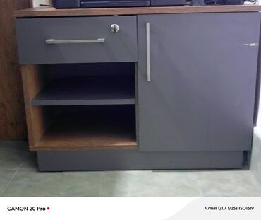 - Yan tumbə: üstü ağac teksturalı, sol tərəfdə kilidli çəkmece, altında iki səviyyəli açıq rəf; sağda qapılı bölmə, tutacaqlar metal rəngdə.