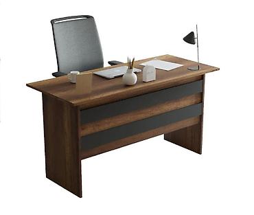 Ofis masası – L formalı dizayn - Material: ağac teksturalı laminat/MDFlam səth - Rəng: tünd qoz (qara dekorativ zolaqlar ilə) - Quruluş: əsas geniş masa + yan konsol/komodin hissəsi - Funksionallı...