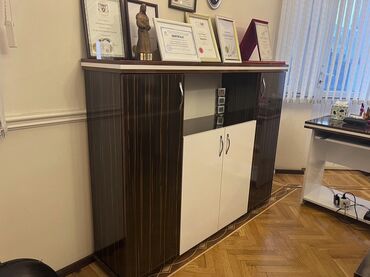 - Sənədlik/şkaf: tünd ağac teksturası və ağ qapılar, bir neçə rəf və bölmələr, üst hissə ekspozisiya üçün əlverişlidir.