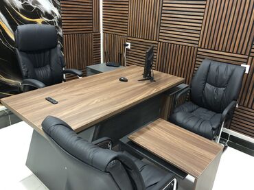 - Direktor masası: geniş iş səthi, ağac fakturalı üst, ön panel, sağ tərəfində açıq rəf bölməsi