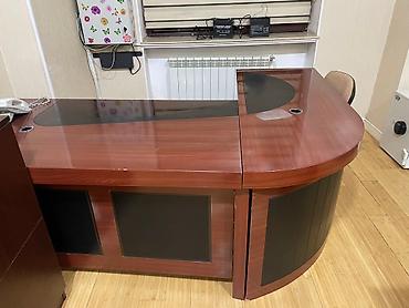 - İşçi masası: Düz formalı, tünd qırmızı taxta fakturalı üst səth, açıq rəng ön panel və yan dayaqlar. Üst hissədə kabel üçün yuvarlaq çıxış.